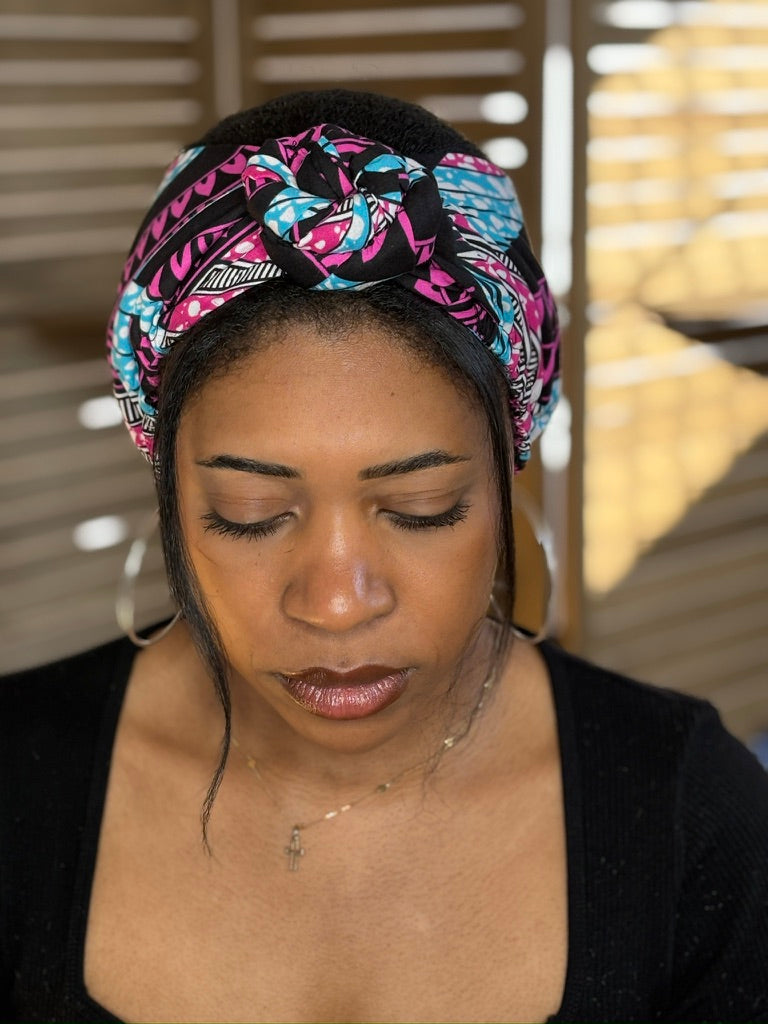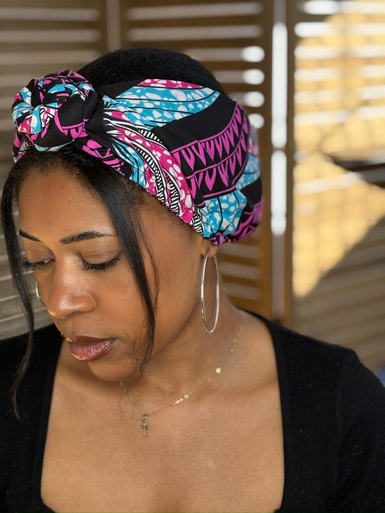 Ce bandeau a été confectionné à la main à partir d’un wax aux motifs contrastés : bleu lagon, rose fuchsia et noir profond, relevés de touches blanches graphiques. . Il s'adapte à toutes les têtes grâce à sa bande élastique.